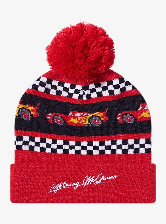 Disney Pixar Cars Lightning McQueen Checkered Pom Pom Youth Beanie