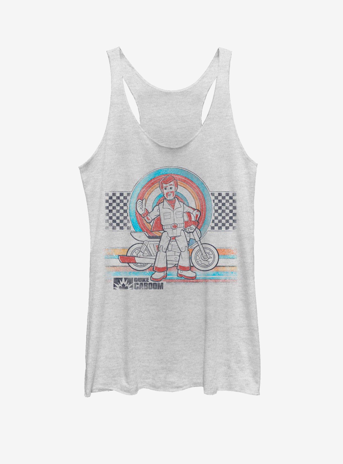 A vintage style top for everybody's favorite Canadian stuntman toy! This heathered white tank has a front screen featuring Duke Caboom from Toy Story 4.