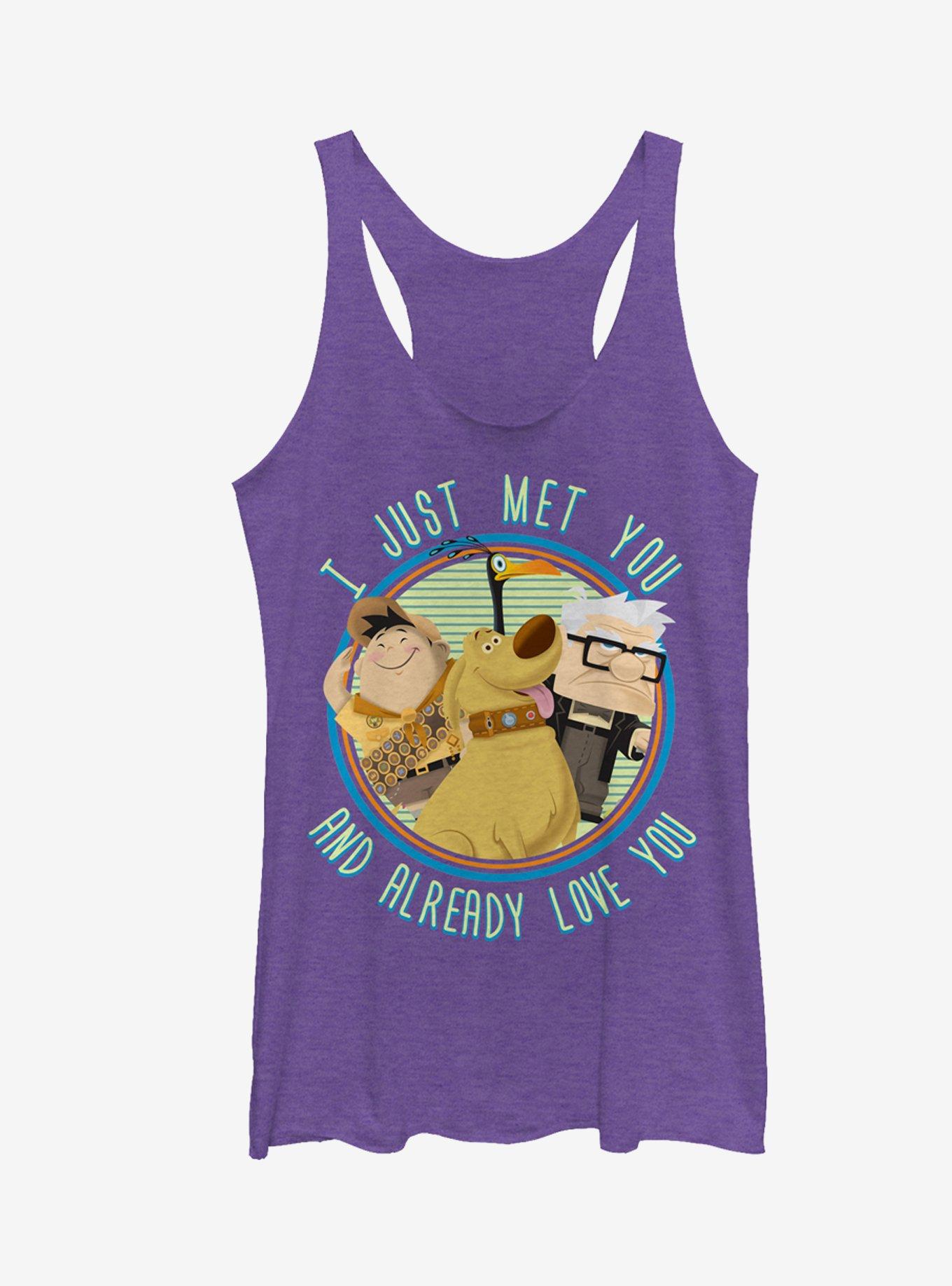 Dug loves you almost as much as he loves the Up Dug Already Love You Heather Purple Racerback Tank Top! Russell, Dug, Kevin, and Carl are encircled by "I Just Met You And Already Love You" down this cute purple Up tank top to remind you that friendship can blossom anywhere. 50% Polyester, 25% Cotton, 25% Rayon. Designed with raw edge hems