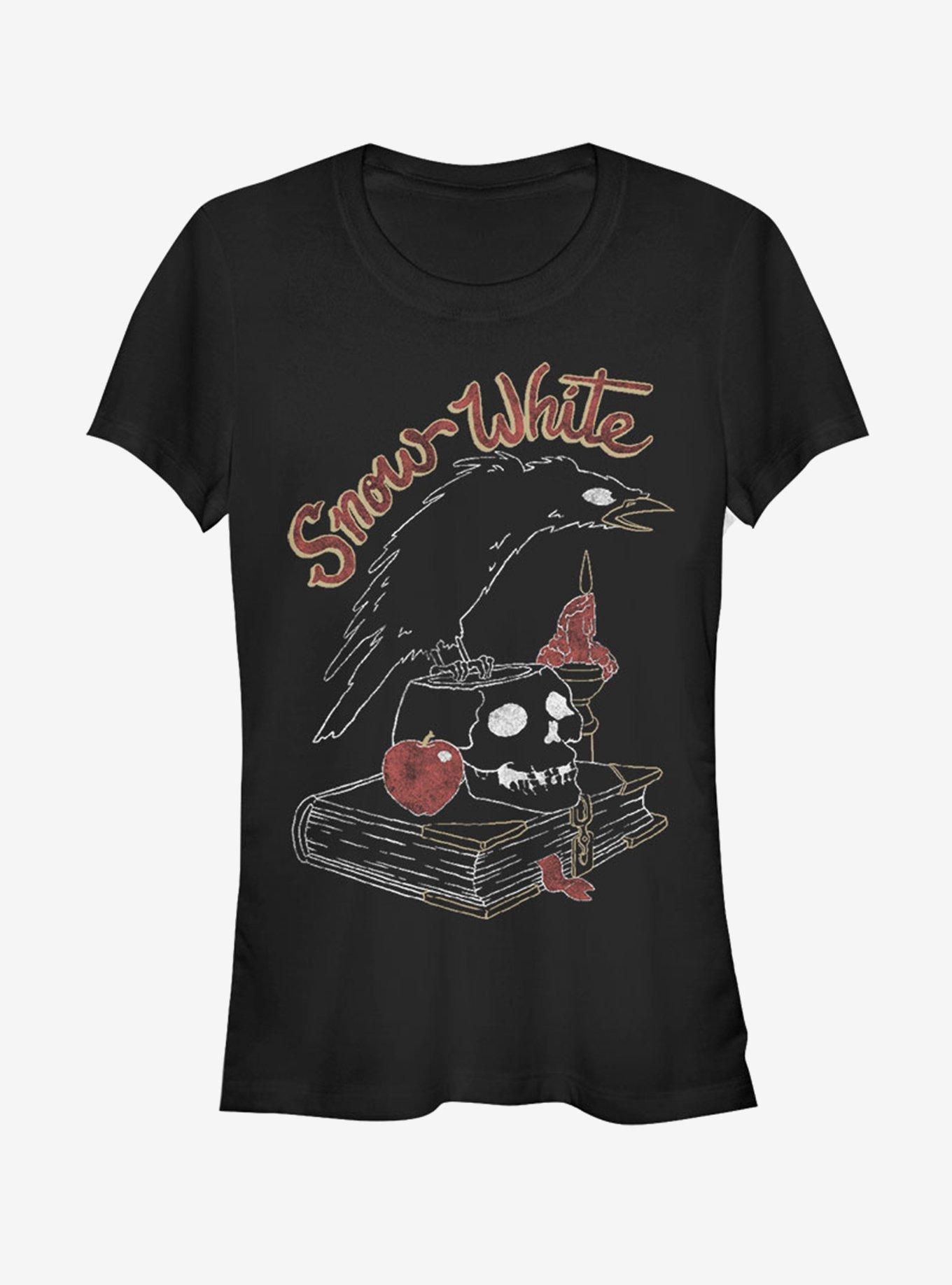 Boil, cauldron, boil! The Evil Queen's pet raven appears on the front of this fitted black tee atop its favorite hiding spot, a hollowed-out skull.