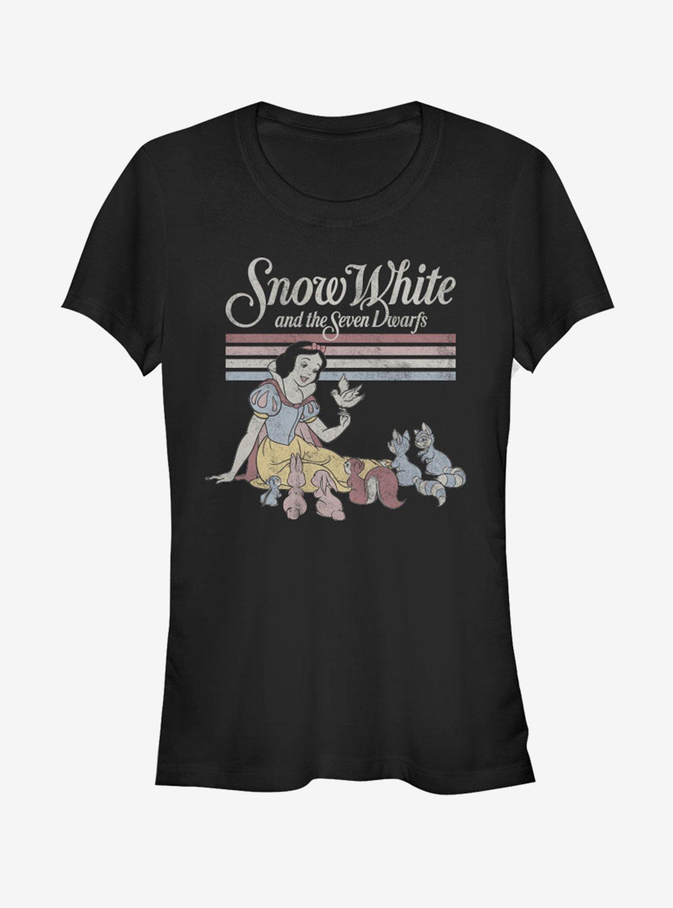 Snow White had a special connection with her forest friends. This fitted black tee, inspired by Disney's Snow White and the Seven Dwarfs , shows our heroine giving a smile and a song to the lucky woodland creatures in her life.