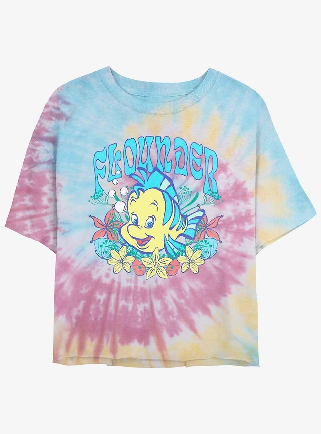 Disney The Little Mermaid Flounder Floral Wreath Tie Dye Crop Womens T-Shirt