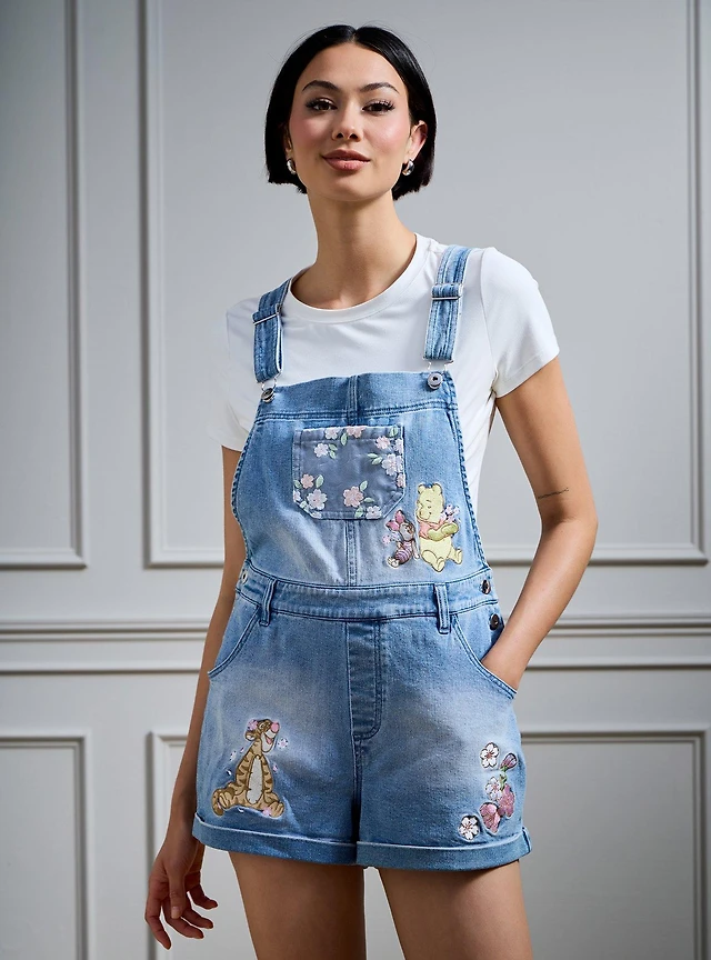 Disney Winnie the Pooh Floral Embroidered Women's Short Overalls