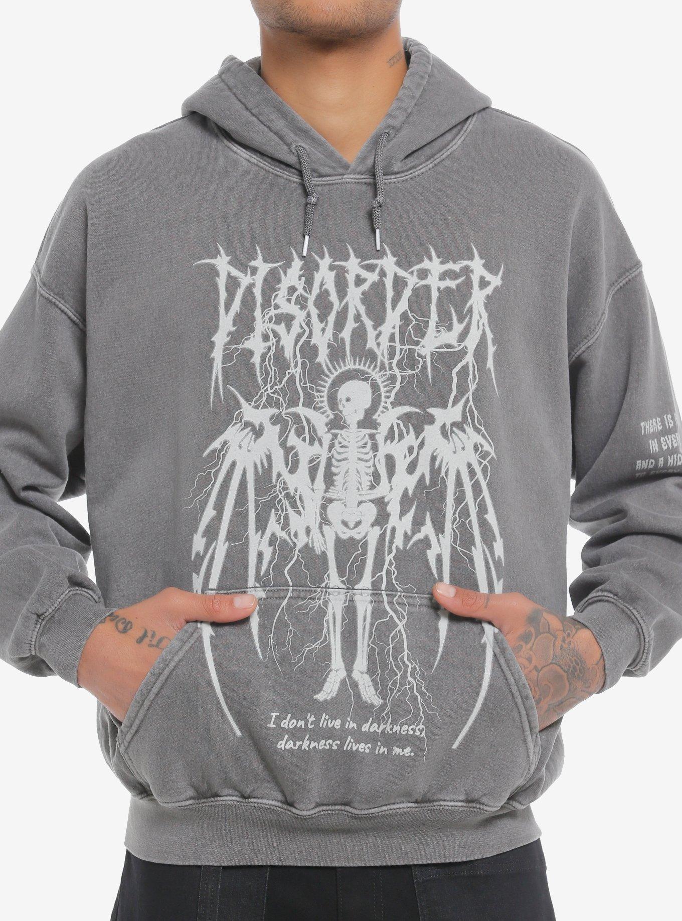 Bring out your inner darkness with this hoodie! It has an oversized fit and features a skeleton angel graphic on the chest with "Disorder" printed above and lightning all around. Verbiage is printed on the sleeves and kangaroo pocket.
