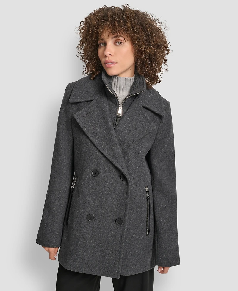 Step into modern sophistication with this Dkny coat, featuring a built-in bib that creates a sleek, dimensional look. The zip front with button overlay offers double protection against the chill. A collared neckline enhances its classic, tailored appeal, while the double-breasted design blends smart style with added warmth.
