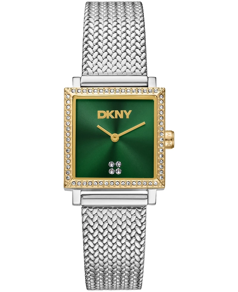This 24 x 31mm Dkny timepiece features a sleek square silhouette that brings a modern, architectural feel to the wrist. Framed by a halo of sparkling stones, the rich dial is anchored by the Dkny logo at 12 o'clock, with four subtle stones at 6 o'clock echoing the geometric shape of the case for a thoughtful design detail. Finished with a fluid stainless steel mesh bracelet, it wears effortlessly with a light, jewelry-inspired feel.