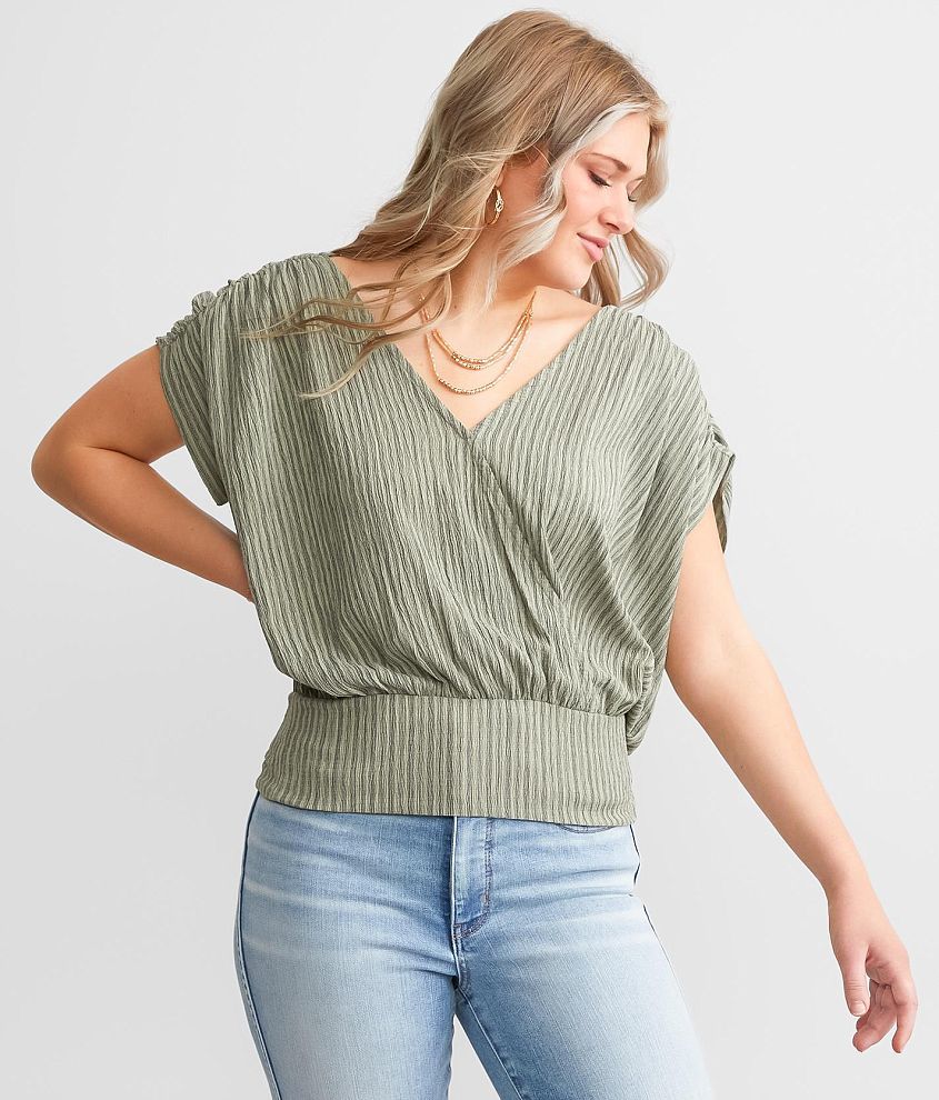 Striped crinkle banded hem top Ruched sleeves and tie details Bust measures 50" on size small Body length 21" on size small