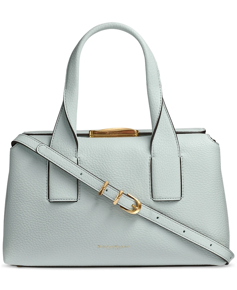 Crafted in leather, this satchel by Donna Karen is a chic choice for everyday style. Opening up to a functional interior with a center zip compartment, the gold-tone custom curved closure adds a signature touch.