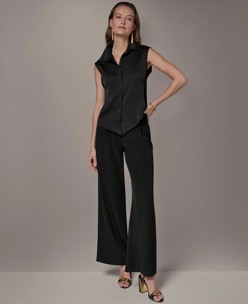 Sophisticated yet effortless, this Donna Karan New York top is a versatile wardrobe staple featuring a classic collar and sleeveless design. It hits at the hips for a flattering, polished look, and the front button closure offers a sleek finish.