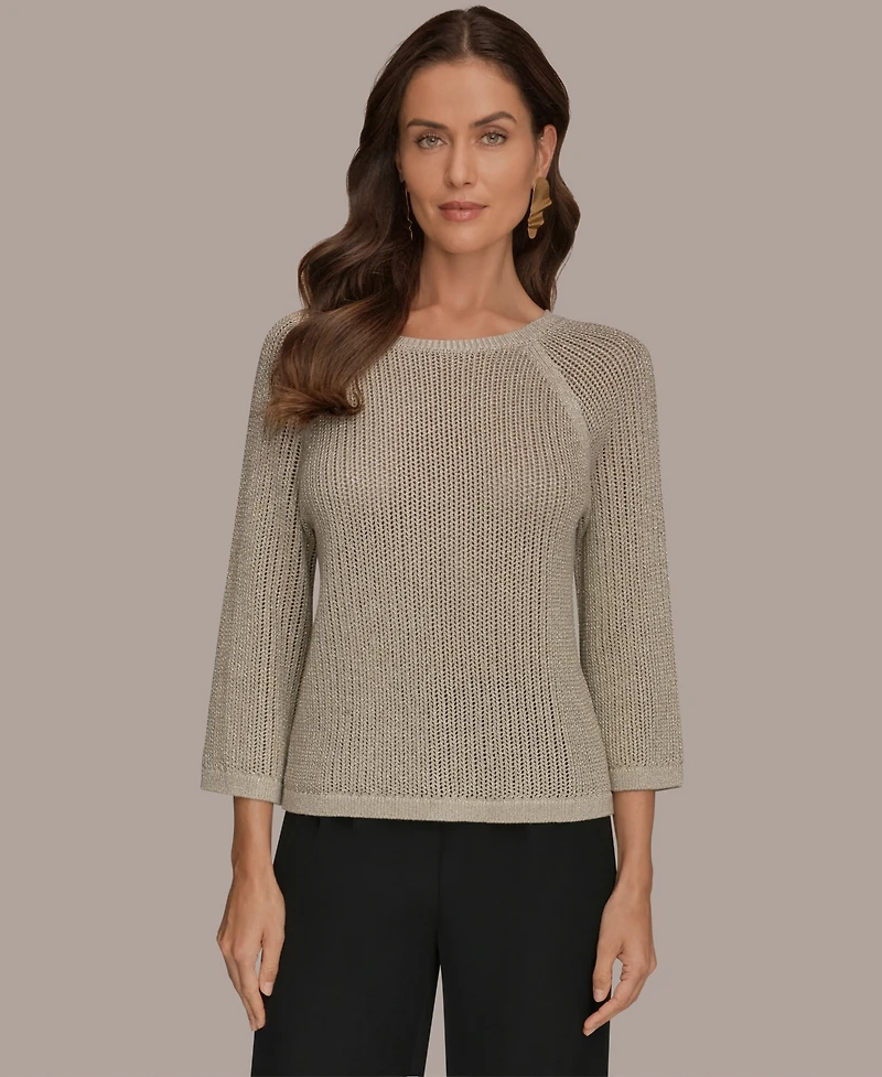 Subtle shimmer and a streamlined silhouette define this Donna Karan New York petite sweater top. Designed with a classic crewneck and short sleeves, it delivers a comfortable fit, while the soft metallic-infused knit adds a touch of elegance.