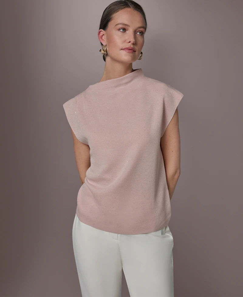Wrap yourself in soft sophistication with this Donna Karan New York sweater, featuring a striking asymmetric mock neck that adds a modern, fashion-forward edge. The sleeveless cut allows for versatile layering over shirts or under jackets.