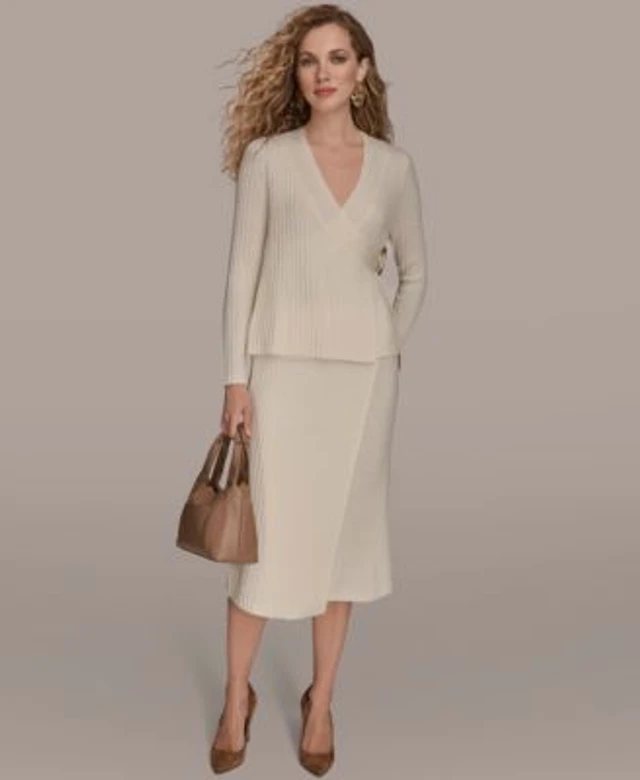 Donna Karan New York Womens Ribbed V Neck Long Sleeve Sweater Knit Wrap Midi Skirt
