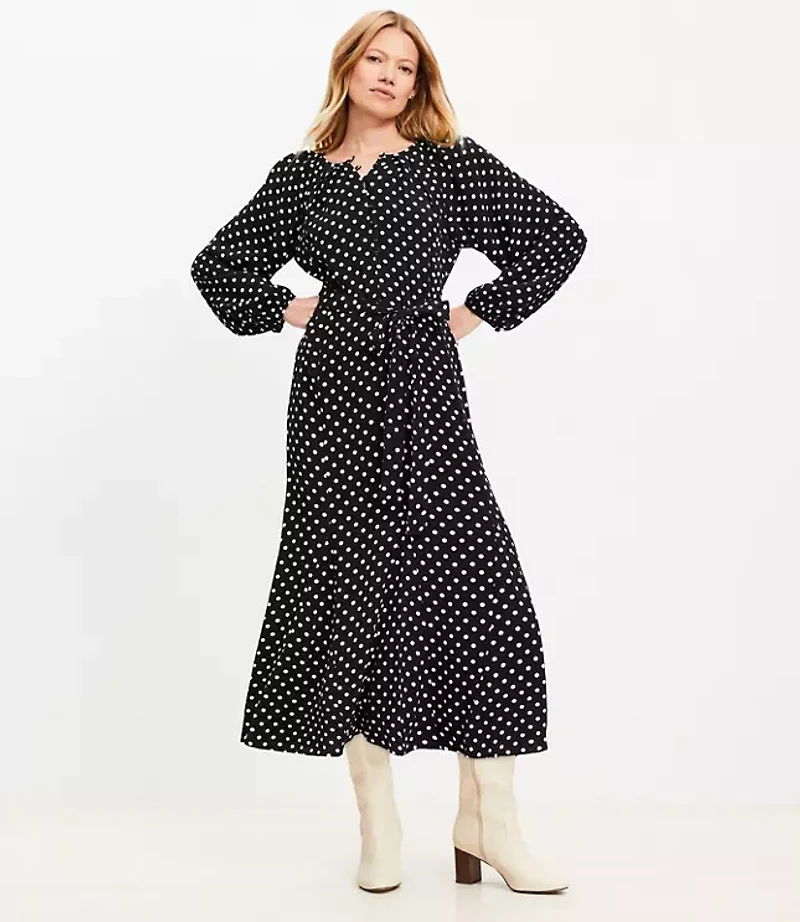 This polished and tailored fluid woven midi dress hits the spot with a dreamy fluttered skirt, flouncing and flowing with godet pleats. Crew neck Long sleeves with slit cuffs. Pleated and button trim. Side zip, Imported:, Fit: Waisted - fits and flatters waist, Length: 48 1/2"from center back neck to hem, measured from a size 8 / M, Fabrication: 100% Viscose, Garment Care: Machine Washable Loft Dotted Button Godet Midi Dress Size 2 Black Women's by Loft Size Regular - 2 Black Women's Fit, & Flare Dresses Work 100% Viscose Machine Washable