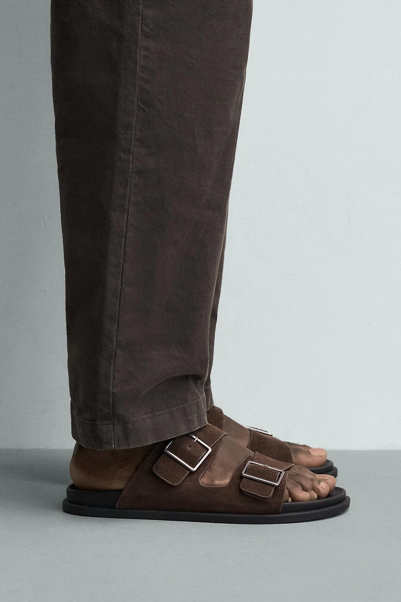 Leather sandals with split leather finish. Two wide straps at instep with buckle closure. Anatomical insole. Flat contrasting soles.