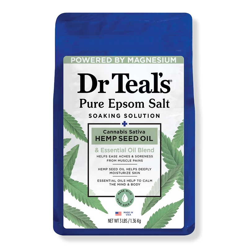 HEMP SEED OIL 3LB EPSOM SOAK 48.0OZ. Benefits: Dr Teal's Pure Epsom Salt Soaking Solution soothes the body and provides the ideal opportunity to relax in a warm bath, quiet the mind, de-stress and revitalize skin. A soothing blend of Hemp Seed Oil (Cannabis Sativa), White Thyme, Cedarwood & Bergamot essential oils help calm the mind. Dr Teal's Soaking Solution combines Pure Epsom Salt, which has long been known to revitalize tired, achy muscles, with essential oils to soothe the senses and help provide relief from stress. Soak for 20 minutes for relief of sore muscles. Be sure to combine with your favorite Dr Teal's Foaming Bath. Bags feature a VELCRO Brand enclosure to make resealing your Epsom salts easier, quicker and sturdier than ever. Made in the USA, paraben and phthalate free and never tested on animals. : :
