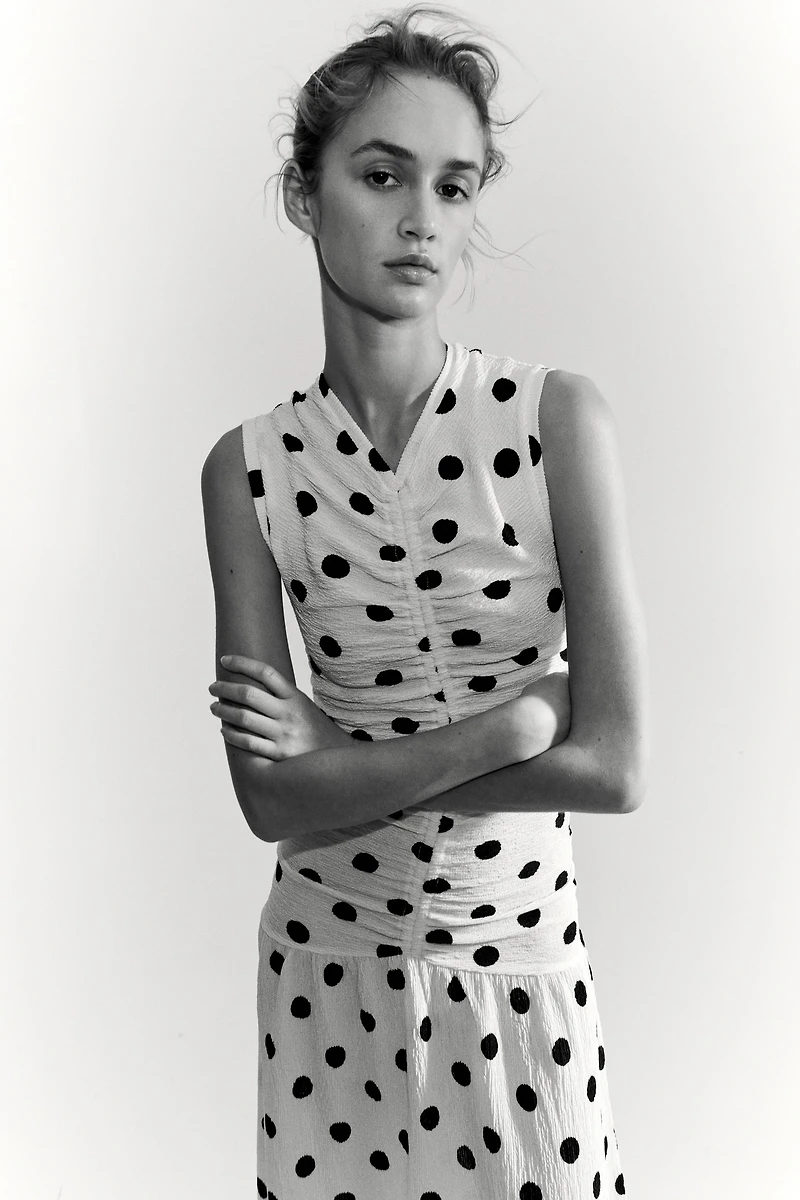 Long, V-neck sleeveless dress in crinkled jersey. Elasticized vertical seam at front, a gathered seam at back with concealed zipper, and a gathered seam below hips. Flared skirt.