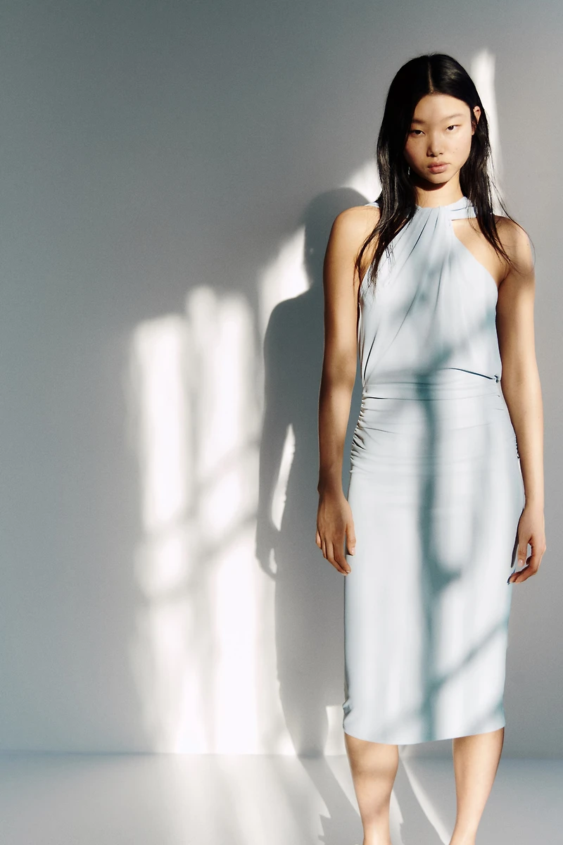 Sleeveless, calf-length dress in soft jersey with a narrow cut at top. Draped linked detail at front, keyhole opening at back of neck with a button, and a draped section at back. Gathered seams at sides for a draped effect at front.