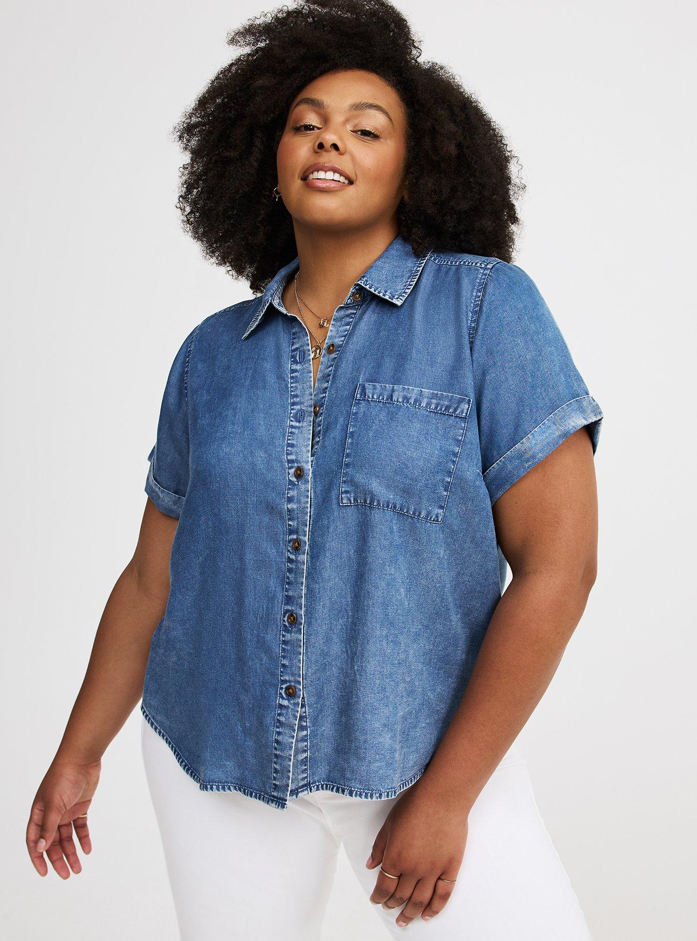 FIT Measures 28"" from shoulder (size 2). MATERIALS + CARE Tencel chambray woven fabric. 100% lyocell. Machine wash cold. Tumble dry low. Imported. DETAILS Collared neckline. Short sleeves. Button front.