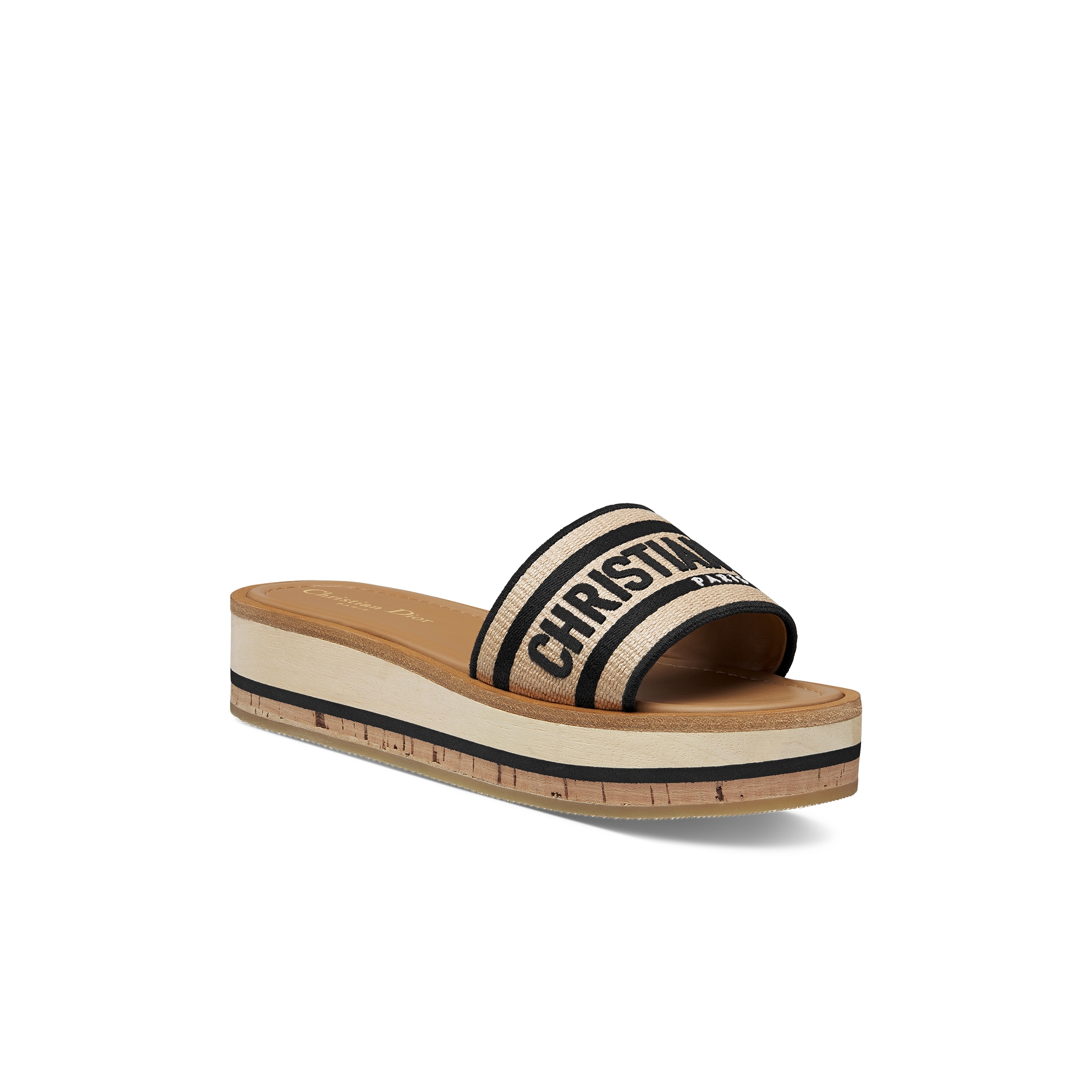 The Dway platform slide has a modern and casual look. The natural raffia and black cotton upper is embroidered with the instantly recognizable Christian Dior Paris signature. Completed by a thick wood, rubber and cork sole, the shoe will elevate any of the season's looks. Main composition: cotton and technical fabric. Goatskin lining. Christian Dior Paris signature embroidered on the upper. Padded calfskin insole. Thick wood, rubber and cork sole with engraved star, Christian Dior's lucky symbol. Made in Italy