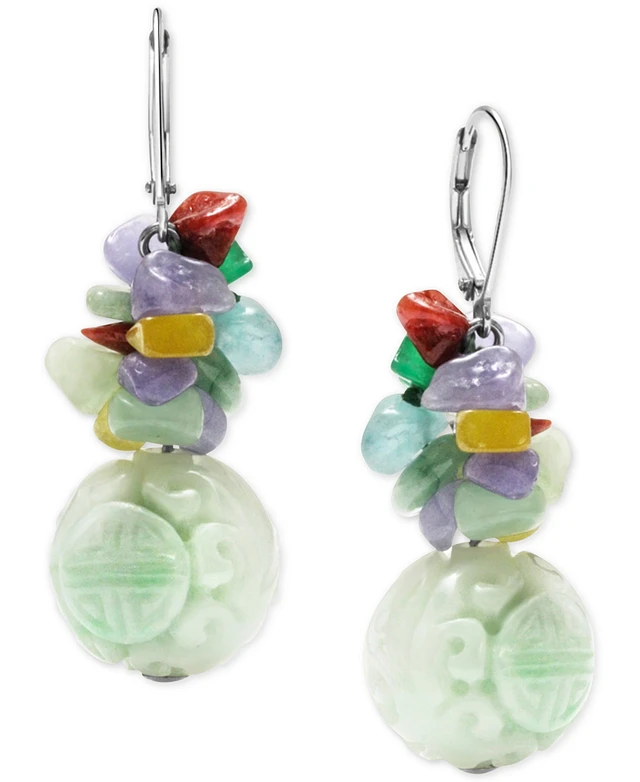 Dyed Jade Carved Bead & Dyed Multicolor Jade Chip Drop Earrings in Sterling Silver