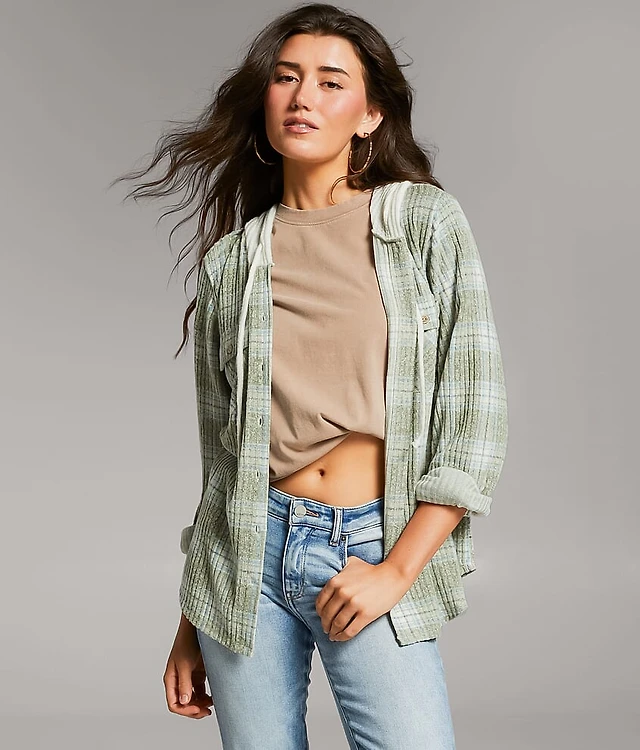 AE Plaid Hooded Button-Up Shirt