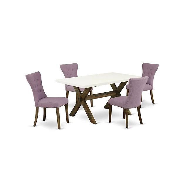 East West Furniture X726GA740-5 5-Pc Dining Room Set- 4 Parson Dining Chairs with Dahlia Linen Fabric Seat and Button Tufted Chair Back - Rectangular Table Top and Wooden Cross Legs - Linen White and Di. Beautiful Dining Room Set: A Dining Table and 4 amazing parson dining room chairs that are enhance the beauty of your dining area. This 5-Piece dining room set adds a modern with a distinctively glossy glance a rectangular table top and Linen Fabric