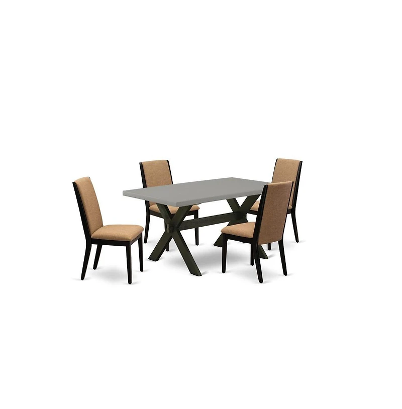 East West Furniture X696LA147-5 5-Piece Beautiful kitchen table set a Superb Cement Color Kitchen Table Top and 4 Gorgeous Linen Fabric Modern Dining Chairs with Stylish Chair Back, Wire Brushed Black. [Gorgeous Dining Room Table Set] This wonderful 4 padded chairs and Stylish Chair Back are the best combination of innovative design and classic style. Our wood dining table includes a rectangular top and solid wood legs.