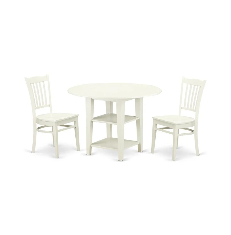 Dining Room Set Linen White, SUGR3-lwh-w. 3 piece Set with one table and two chairs with wood Seat. Round dining table features two 11-inch drop leaves. Good for small kitchen. All Real wood from dining table Top to table legs. No heat treated pressured wood like Mdf, Particle Board or verneer Top fabricated. Table Dimension: Diameter 42 Height 29.5 - Chair Dimension: Length 21 Width 18 Height 37