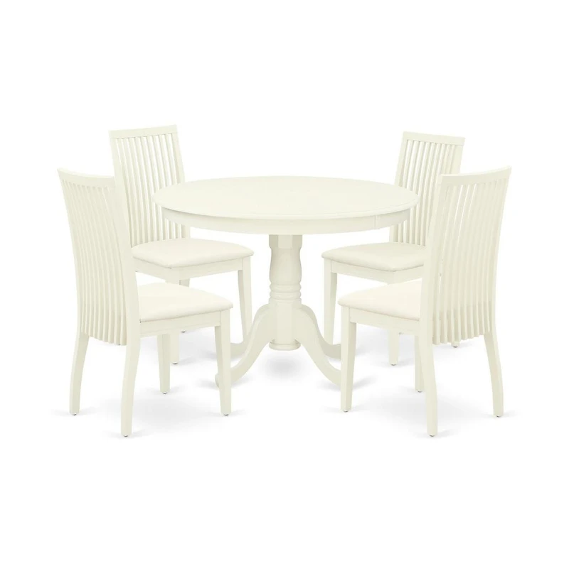 Dining Room Set Linen White, HLIP5-lwh-c. Our dining set includes a modern dining table and 4 wood dining chairs, our modern dining table and Linen Modern dining chairs are comfortable in any dining room as well as in kitchen areas. This dining room set will comfort to modern aesthetics, whi. This color of the dining table set is Linen White finish.