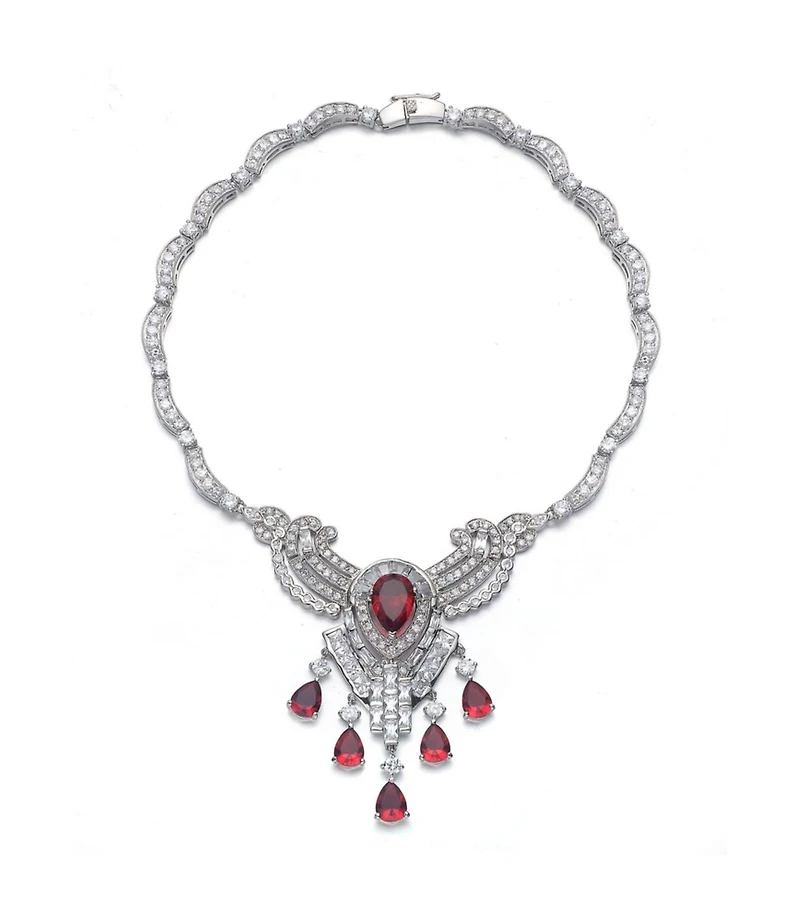 Elevate your style with this elegant statement teardrop necklace, a sophisticated masterpiece designed to make any outfit stand out. Crafted from premium .925 sterling silver with a brilliant White Gold Plated finish, this fancy necklace showcases a stunning Art Deco-inspired drop pendant. The centerpiece features a prominent pear-cut cubic zirconia available in three magnificent simulated cubic zirconia colors: Blue, Green, or Red. This striking central cubic zirconia is exquisitely framed by a lavish halo and intricate pave settings of smaller round-cut clear cubic zirconia accents, creating unparalleled sparkle. Five additional dangling pear-cut Cz stones cascade beautifully below, enhancing the delicate teardrop shape and adding unique movement to the piece. Securing comfortably with a classic box clasp, this high-fashion accessory is the perfect choice for any special occasion where you want to enhance your beauty and capture attention.