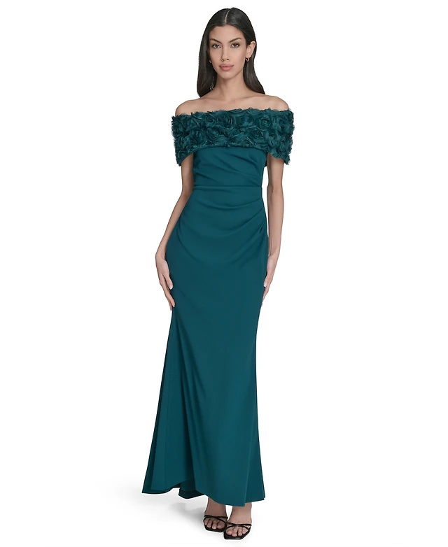 Eliza J Petite Rosette-Trim Off-The-Shoulder Evening Gown