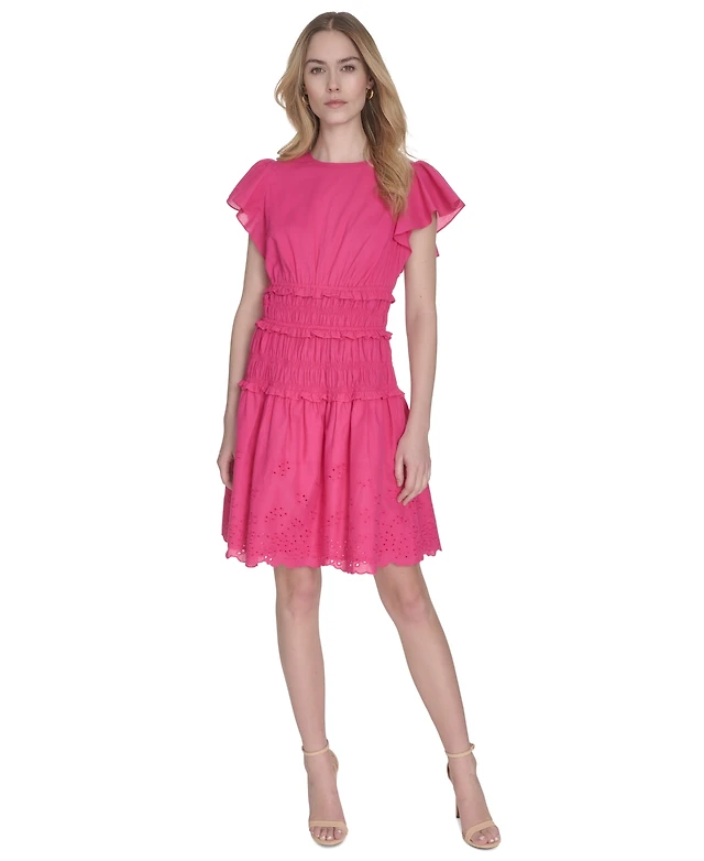 Eliza J Women's Cotton Smocked Embroidered Flutter-Sleeve Dress