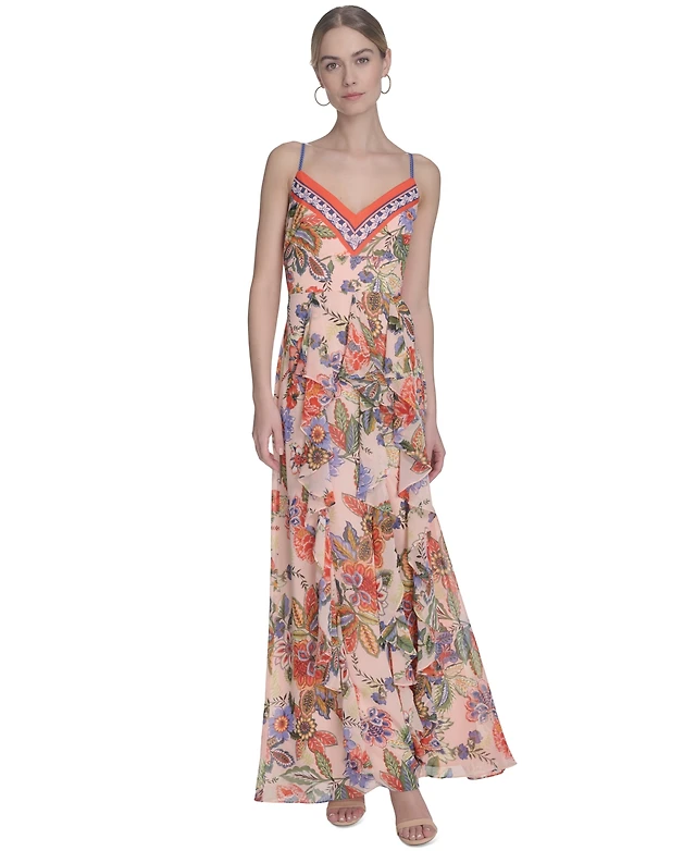 Eliza J Women's Printed V-Neck Ruffe-Trim Maxi Dress
