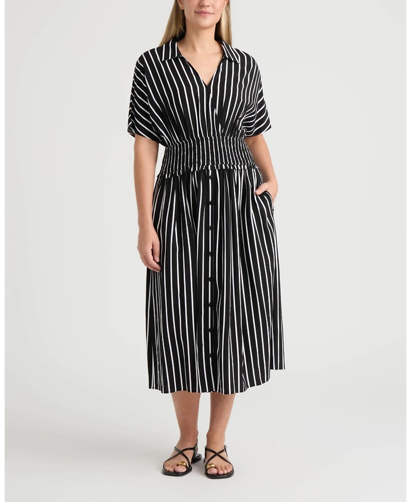 Chic and effortless, this dress features a classic shirt collar and short sleeves. The smocked waistband and flared skirt flatters the figure while ensuring comfort and ease for everyday wear.