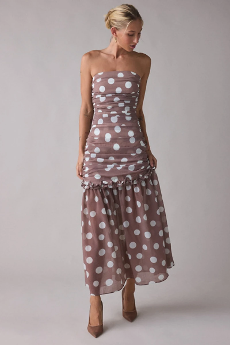 Elliatt Sola Polka Dot Ruched Strapless Maxi Dress