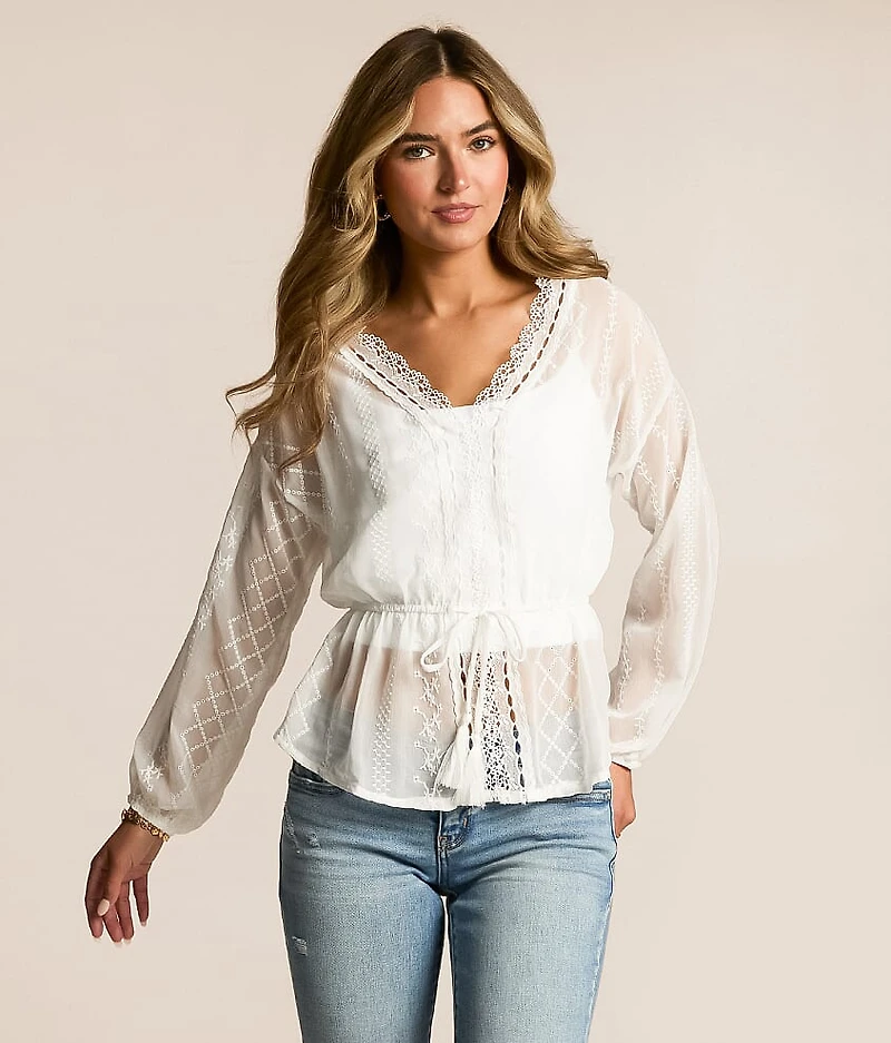 Sheer v-neck top Elasticized cinch tie waistband Elasticized cuffs Crochet trim Bust measures 40" on size small Body length 23" on size small