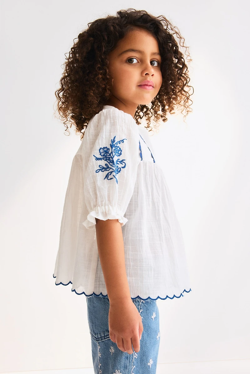Flared blouse in airy woven cotton with contrasting embroidery and scalloped trim. Round neckline, buttons at top, and a yoke at front and back with gathers. Elbow-length puff sleeves with ruffled, elasticized cuffs.