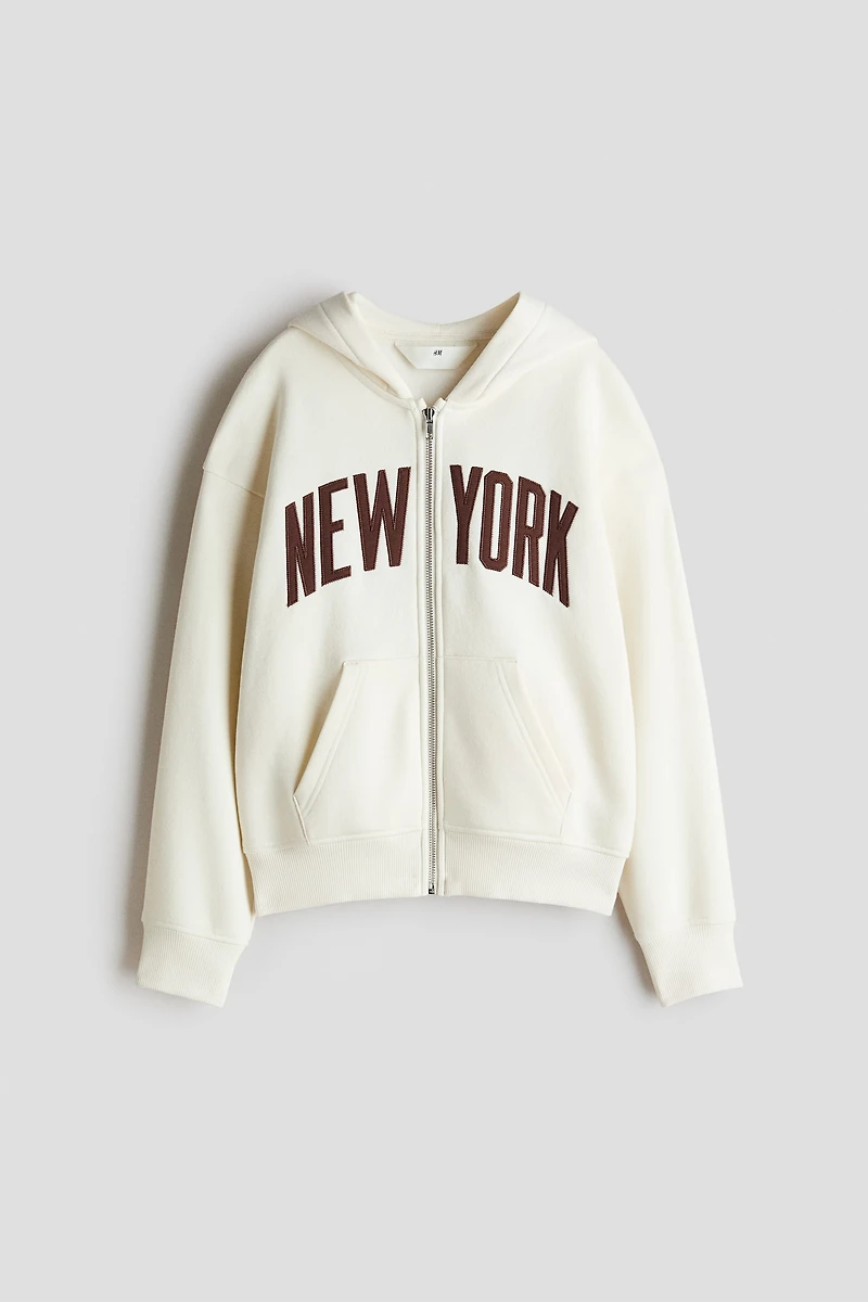 Loose-fit sweatshirt jacket with an embroidered motif at front and soft, brushed inside. Lined hood, zipper at front, and front pockets. Heavily dropped shoulders, long sleeves, and ribbing at cuffs and hem.