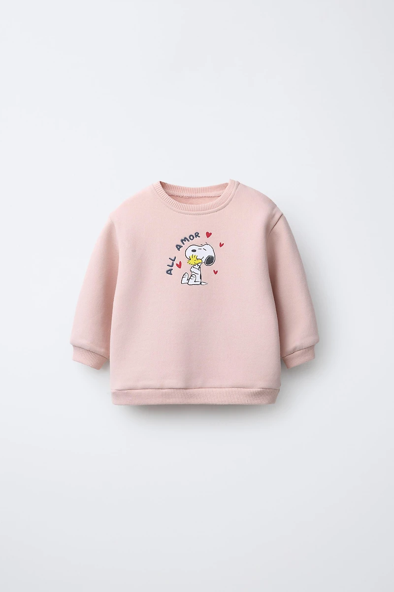 Round neck, long sleeve sweatshirt. Ribbed trim. Snap button closure on the shoulder. Embroidered SNOOPY PEANUTS™ details on the front and back. Brushed interior, warm and soft quality.