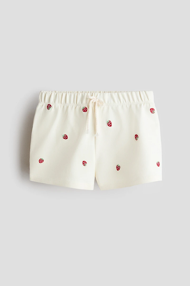 Lightweight sweatshorts in cotton with embroidered details. Elasticized waistband with a decorative drawstring, and a slit at hems.