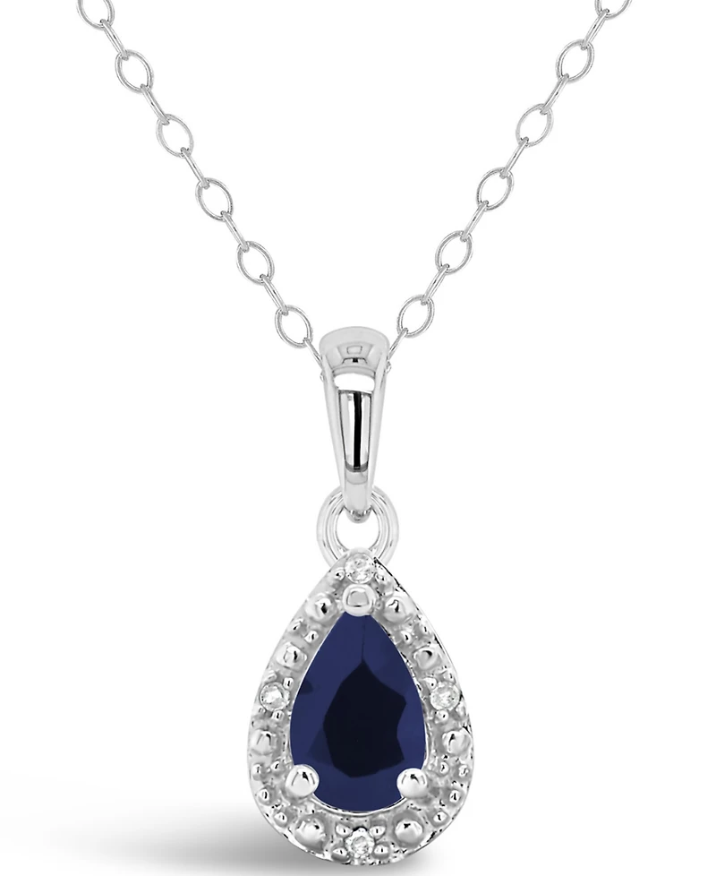 This radiant pendant necklace features a genuine 6x4 pear-shape gemstone surrounded by diamonds. Made from sterling silver. Perfect for any occasion. Available in Sapphire and Emerald