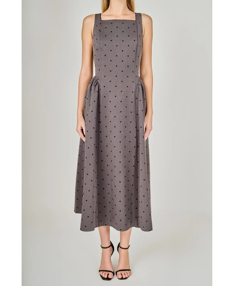 endless rose Women's Square Neck Polka Dot Gathered Waist Midi Dress