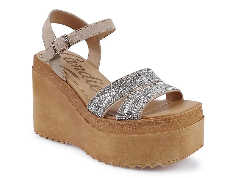 Heighten the mood in the Erykah sandal from Candie's. Glitzy rhinestones, a chunky platform sole, and soaring wedge heel make for a bold highlight to your summery wardrobe.