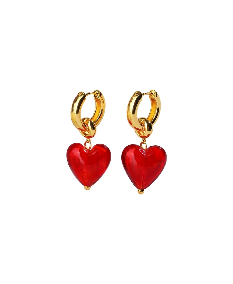 These drop earrings boast a sweet mix of rich colors, with shimmering gold flecks swirling throughout. The handmade heart-shaped dangles adorned with gold hoops make the earrings chic and modern in their beauty. The glaze colors are achieved by adding minerals into the glass and will never fade.