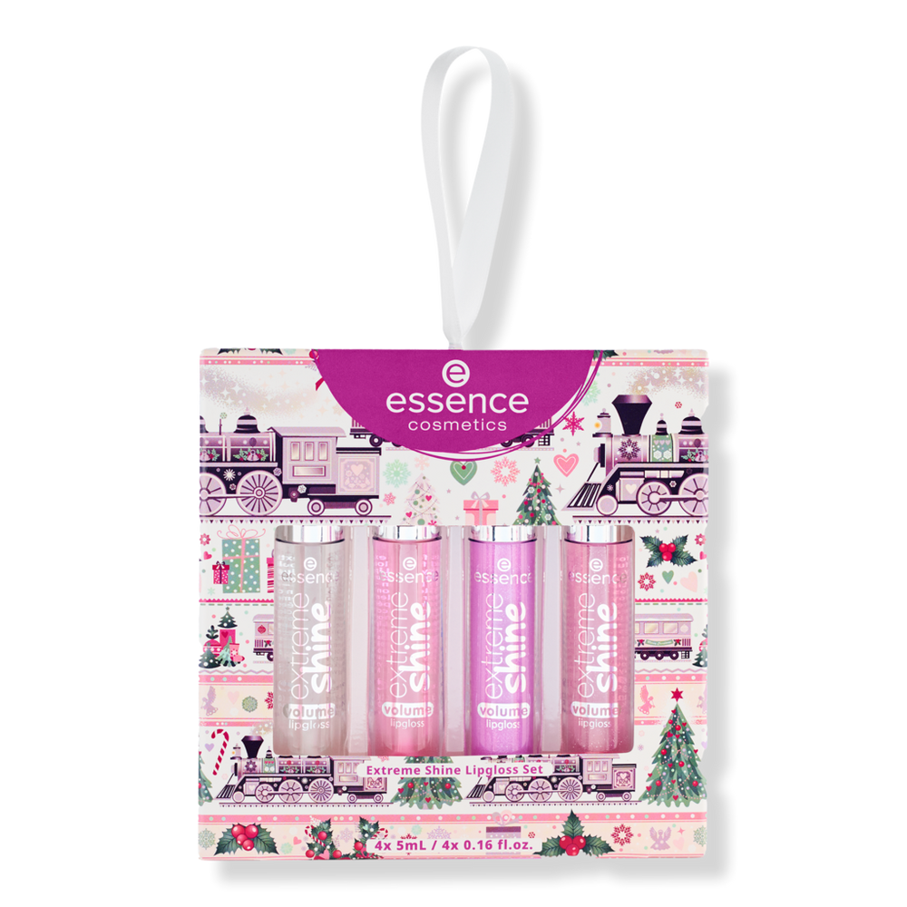 ESS. HOLIDAY KIT EXTREME SHINE LIP. Features: Extreme Shine Lip Gloss 01 Clear. Extreme Shine Lip Gloss 02 Bubblegum Pink. Extreme Shine Lip Gloss 10 Purple Shimmer. Extreme Shine Lip Gloss 102 Iridescent Pink. Packaged in festive custom essence holiday themed packaging. Formulated Without: Animal by-product. :
