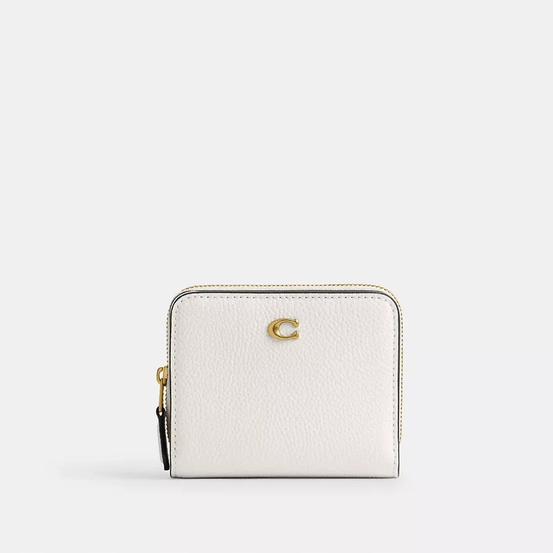 Crafted of polished pebble leather detailed with our Signature hardware, this compact billfold wallet features a convenient exterior zip pocket for coins, receipts, earbuds and other small essentials. It unsnaps to reveal eight card slots and a full-length bill compartment.