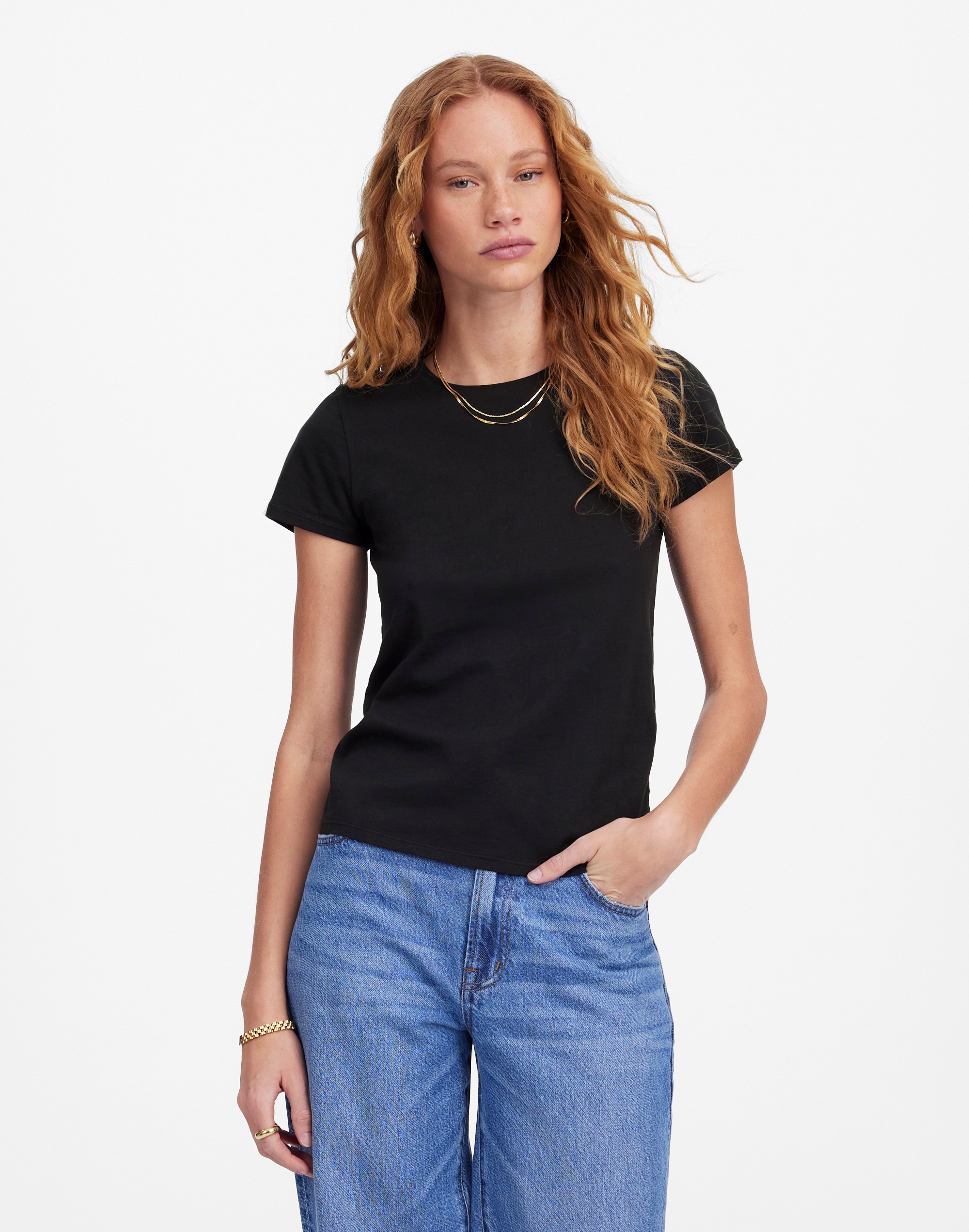 This slim shrunken tee is the ultimate wardrobe essential. Crafted from lightweight cotton jersey, it features a flattering on-body fit and center back seam.