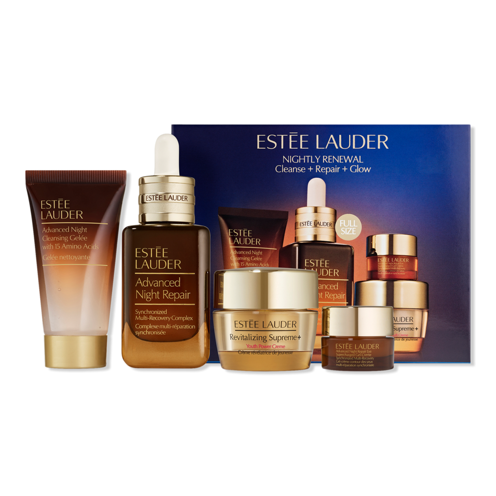 ANR / SUPREME NIGHTLY RENEWAL SET. Includes: Full-size Advanced Night Repair Synchronized Multi-Recovery Complex (1.7 oz). Deluxe travel size Advanced Night Cleansing Gele with 15 Amino Acids (1.0 oz). Deluxe travel size Revitalizing Supreme+ Youth Power Crme (0.5 oz). Deluxe travel size Advanced Night Repair Eye Supercharged Gel-Creme Synchronized Multi-Recovery (0.17 oz). Benefits: Advanced Night Cleansing Gele washes away makeup & impurities from skin's surface, without stripping or disturbing the moisture barrier. Helps skin feel soft, comfortable, balanced. Advanced Night Repair Serum helps skin look smoother & less lined, younger, more radiant and even toned. With continued use, Revitalizing Supreme+ Moisturizer significantly improves skin's firmness & elasticity for a firmer feel and more lifted look. Over time, Advanced Night Repair Eye Supercharged Gel-Creme significantly reduces the look of lines, wrinkles, undereye puffiness and dark circles. Look like you got your 8-hour beauty sleep even if you didn't. Features: Discover these high-performance formulas to help reduce the look of lines & wrinkles and reveal beautiful, healthy-looking skin. Great gift set includes a full-size Advanced Night Repair; every night, while you sleep, this revolutionary serum helps ignite skin's natural nightly renewal fast.