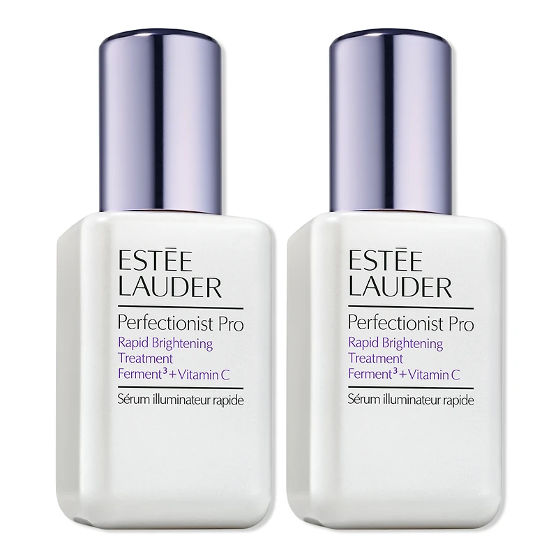 PERFECTIONIST PRO RAPID BRGHT TRTMT DUO. Benefits: This duo includes two full-size 1.7 oz./50ml bottles of Perfectionist Pro Rapid Brightening Treatment.. Triple-active power. Inspired by professional treatments, this Vitamin C powered serum rapidly ignites skin's radiance and targets multiple types of dark spots to reveal a more even-toned look.. Inspired by professional treatments, it rapidly brings radiance and luminosity to dull, lackluster skin. Targets the appearance of multiple types of spots and uneven skintone.. Anti-oxidants help protect against environmental damage and the formation of new skin discolorations. Reveals the look of more even-toned, dewy, glowing skin.. The fast-absorbing formula of the Rapid Brightening Treatment helps smooth skin's texture and enhance the natural radiance of your glowing skin.. Anti-oxidants help protect against environmental damage and the formation of new skin discolorations. Oil-free. Gentle on all skin types.. Key Ingredients: 3 POWER FERMENTS + VITAMIN C. With its exclusive complex of radiance-boosting actives, this Ferment3 plus Vitamin C serum helps CALM skin so it can help resist irritation-induced dark spots. Helps BREAK the cycle of dullness.. Helps BLOCK the appearance of future dark spots with powerful anti-oxidants. And helps BOOST an undeniable clarity.. What is Ferment3? A powerful triple-ferment combining a high concentration of our exclusive Yeast Ferment with a spot-targeting Molasses Ferment plus a proprietary Algae Ferment with powerful soothing activity.. All three ferments work to help reduce the appearance of dark spots and enhance clarity and calm for glowing skin. Este Lauder scientists are experts in fermentation, a process that concentrates and amplifies an ingredient. Their ferment complex is 98% naturally derived.(5). What is Vitamin C? It's a renowned radiance-boosting, anti-aging and skin-boosting active. In this Rapid Brightening Ferment3 + Vitamin C serum, it targets dark spots in the deepest layer of skin's surface to help reduce the look of skin discolorations.. And with its anti-oxidant properties, it helps prevent the appearance of new spots and skin discolorations.. Research Results: 1 WEEK. 96% said skin felt smoother.(1). 93% said their complexion looked healthy.(1). 87% said skin looked brighter with renewed clarity.(1). Visible improvement(2) in radiance, even tone, smoothness and texture.. 2 WEEKS. Dark spots look reducedboth in intensity and contrast(3). 84% of women said their skin looked more even-toned.(4). 1 BOTTLE. See a significant reduction in the look of:. Dark spots, sun spots, age spots. Discoloration, uneven tone. Post-acne marks. Pores. (1) Consumer testing on 280 women after using product for 1 week.. (2) Clinical testing on 114 women after using product for 1 week.. (3) Clinical testing on 114 women after using product for 2 weeks.. (4) Consumer testing on 280 women after using product for 2 weeks.. (5) Per ISO Standard 16128. From plant sources, non-petroleum mineral sources, and/or water..