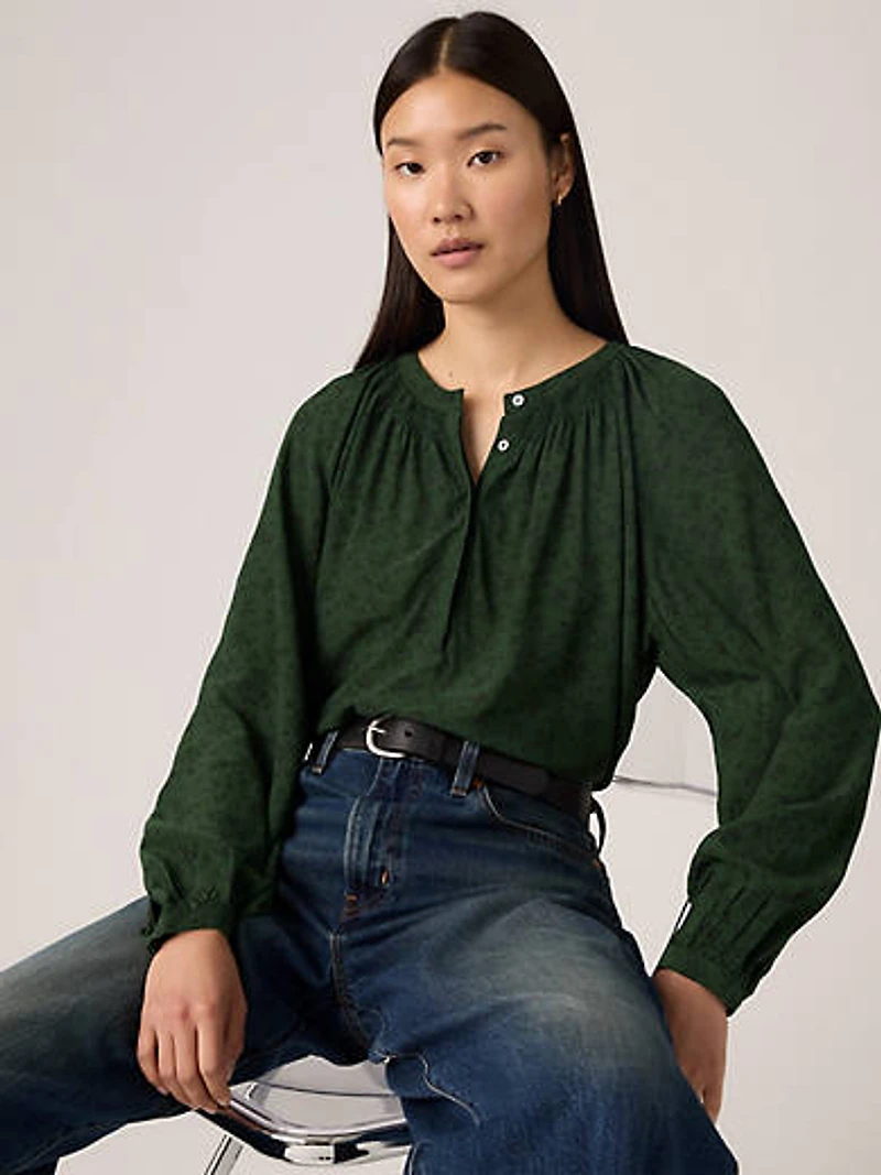 We call our Estelle Long-Sleeve Blouse a wear-everywhere favorite. It features a button-up collar, voluminous sleeves and flowy fit.